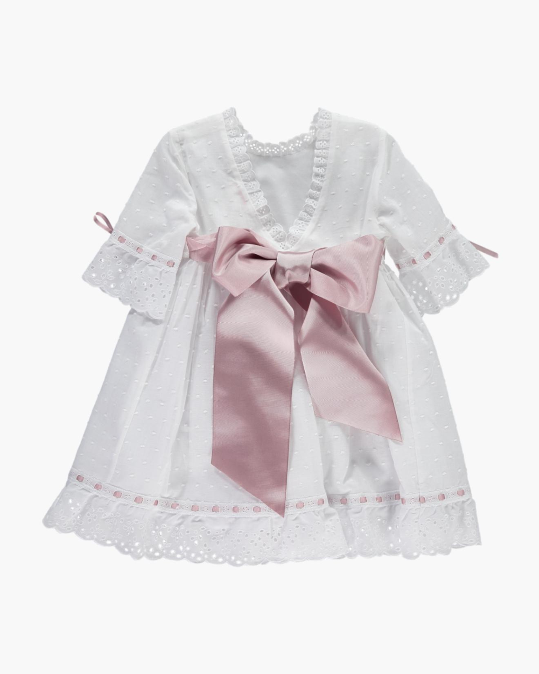 Our stunning white plumetti dress featuring intricate lace embellishments along the collar, sleeves and hems. Finished with a soft silk contrasting ribbon in pink, it fastens spectacularly around the back. The stylish 3/4 sleeves, V-shaped back and exquisite details add an extra special touch to this piece. Ideal for little bridesmaids, flower girls, or any celebration.