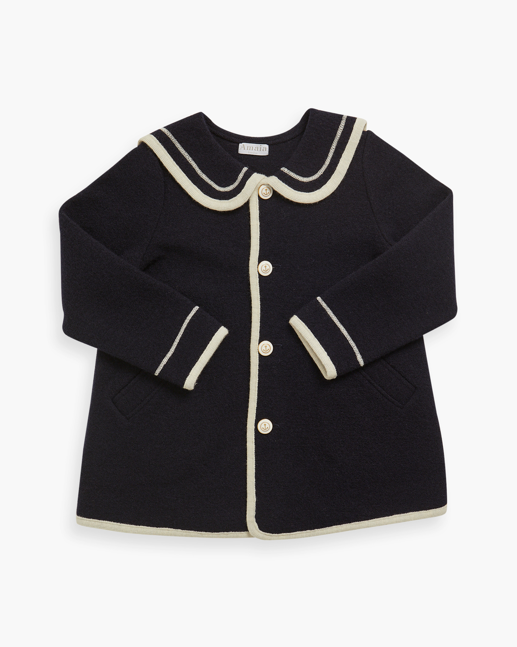 Capture the timeless elegance of classic design with our new sailor-style oversized coat. Crafted from strong, crisp Austrian boiled wool, this girls' coat features embossed white enamel anchor buttons on the front, an oversized sailor collar with white trim and matching trims on the sleeves. Complete with spacious front patch pockets for added comfort, this is a true luxury item that effortlessly melds style and sophistication.
