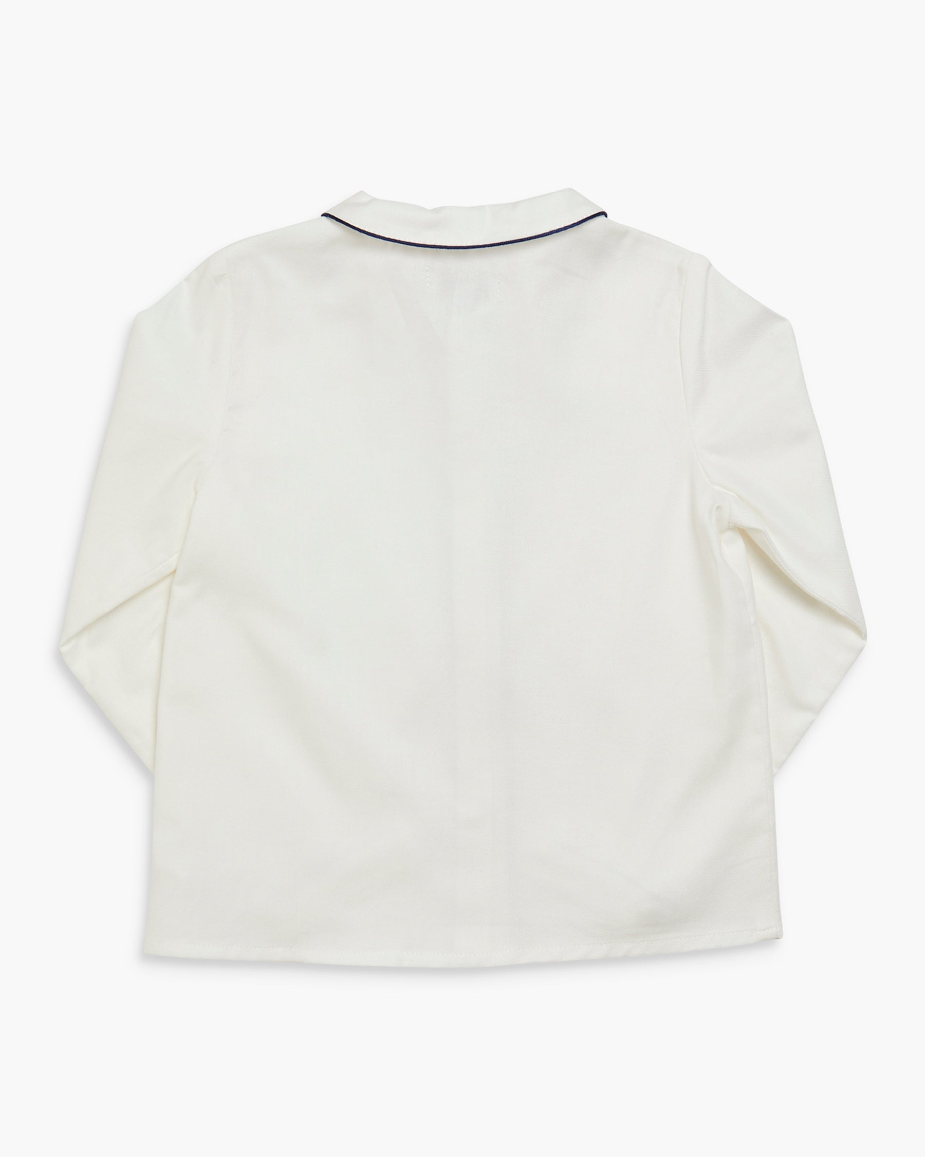 Our iconic Daniel Shirt offers a sleek and stylish look tailored from soft white poplin cotton with contrasting navy piping on the sleeves, collar and placket. Delicate mother-of-pearl button front fastening, adding a special touch to keep your little boy stylish, comfortable and cool throughout the season. Perfectly versatile, it complements effortlessly with shorts, trousers and our classic boy shoes for a polished and refined look. Ideal for any occasion, the Daniel Shirt combines classic charm with modern elegance, ensuring your little one looks effortlessly sophisticated.