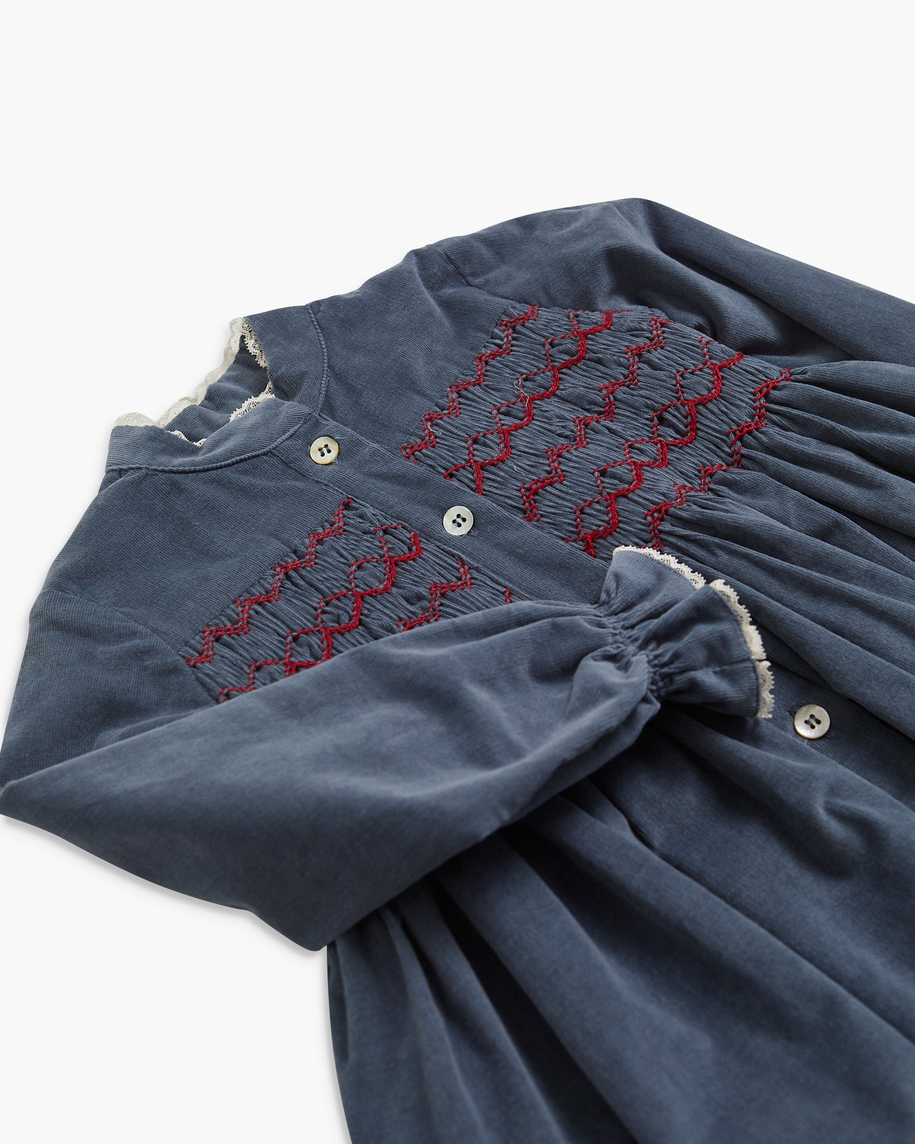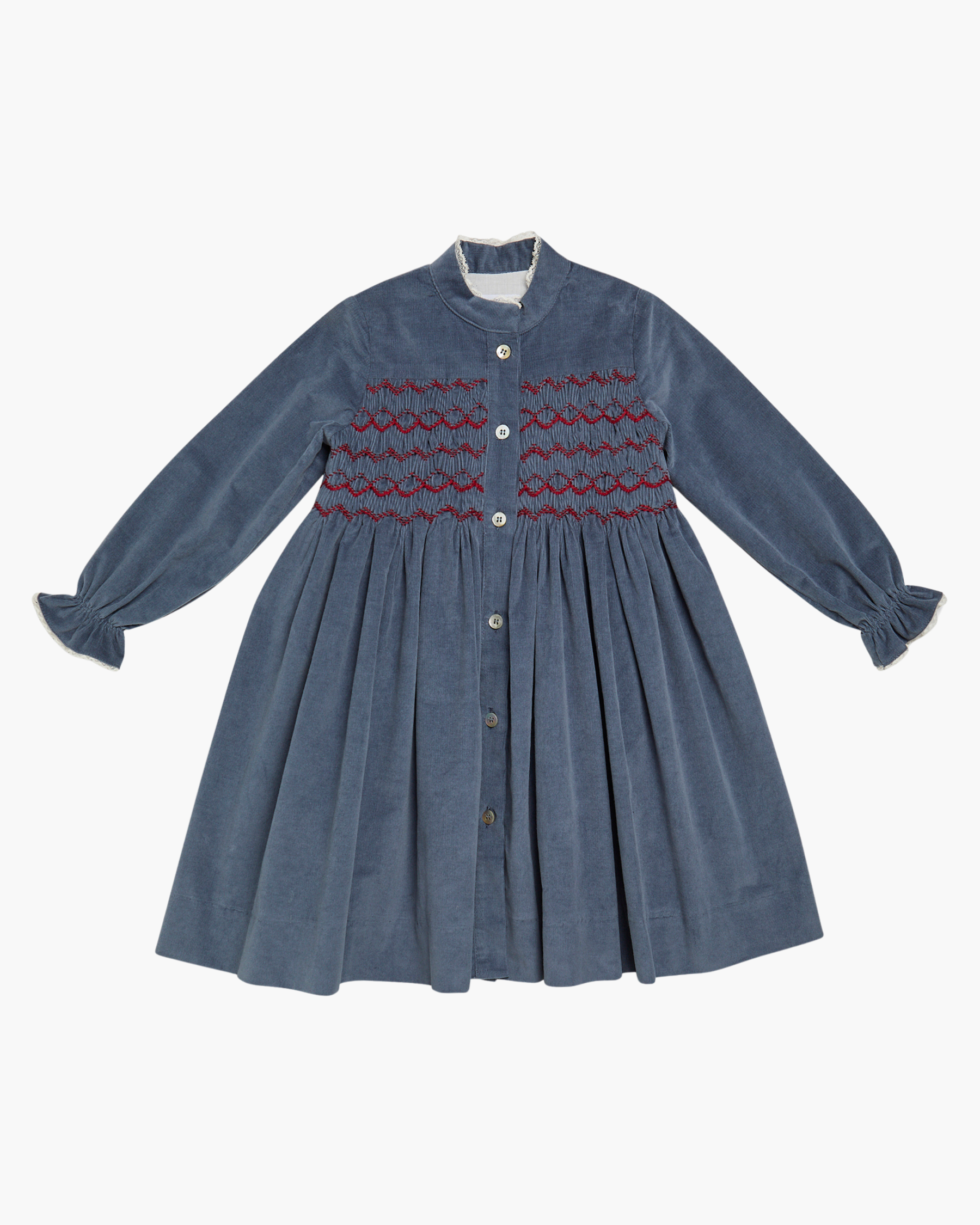 Introducing the Ines dress in Midnight blue corduroy, a sophisticated hand-smocked addition to your little girl's back-to-school wardrobe. Lovingly crafted in Spain, this dress features delicate lace lining on the collar and beautifully shaped cuffs. The hand-smocked contrasting detail across the bodice and mother-of-pearl buttons make it an exceptional piece for the colder season. Designed for a comfortable, slightly loose fit, this dress combines elegance with ease of wear. Style it with classic Mary Janes, matching tights and a pretty hair bow for a complete polished look that is perfect for any occasion.