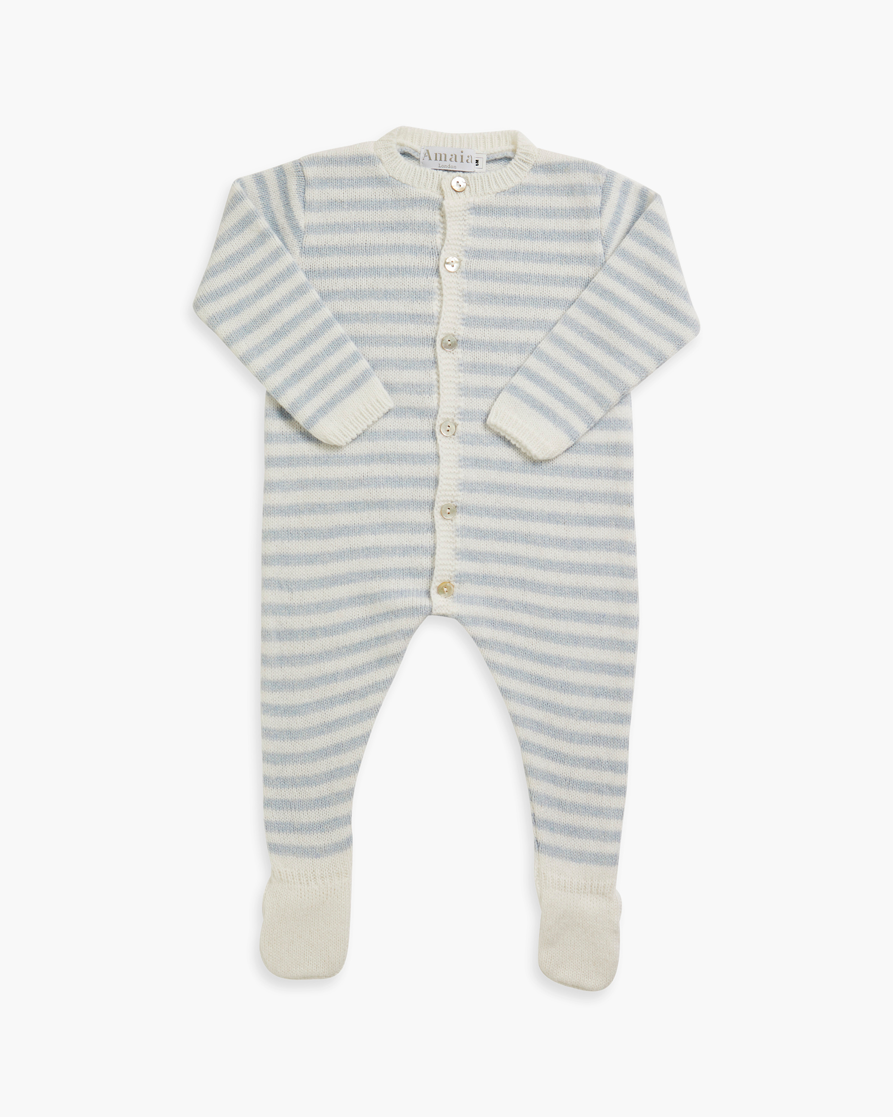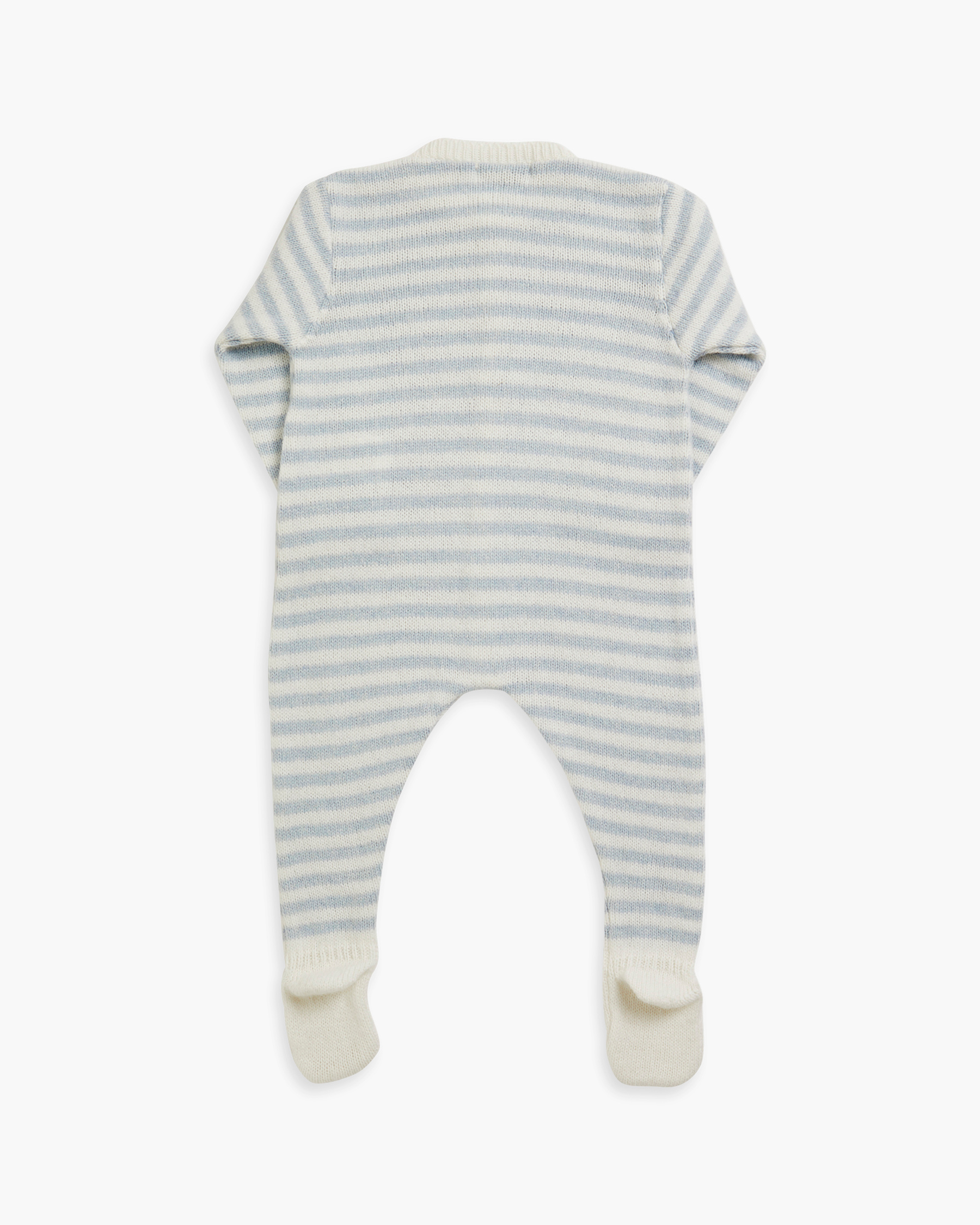 This baby girl’s romper features dusty blue and off-white stripes, crafted from a luxurious blend of cashmere and wool. Its soft knit is kind to delicate skin and enhanced with a contrasting pattern at the neckline and feet, complemented by front button closures. A refined and thoughtful gift, perfect for keeping little ones both warm and stylish.