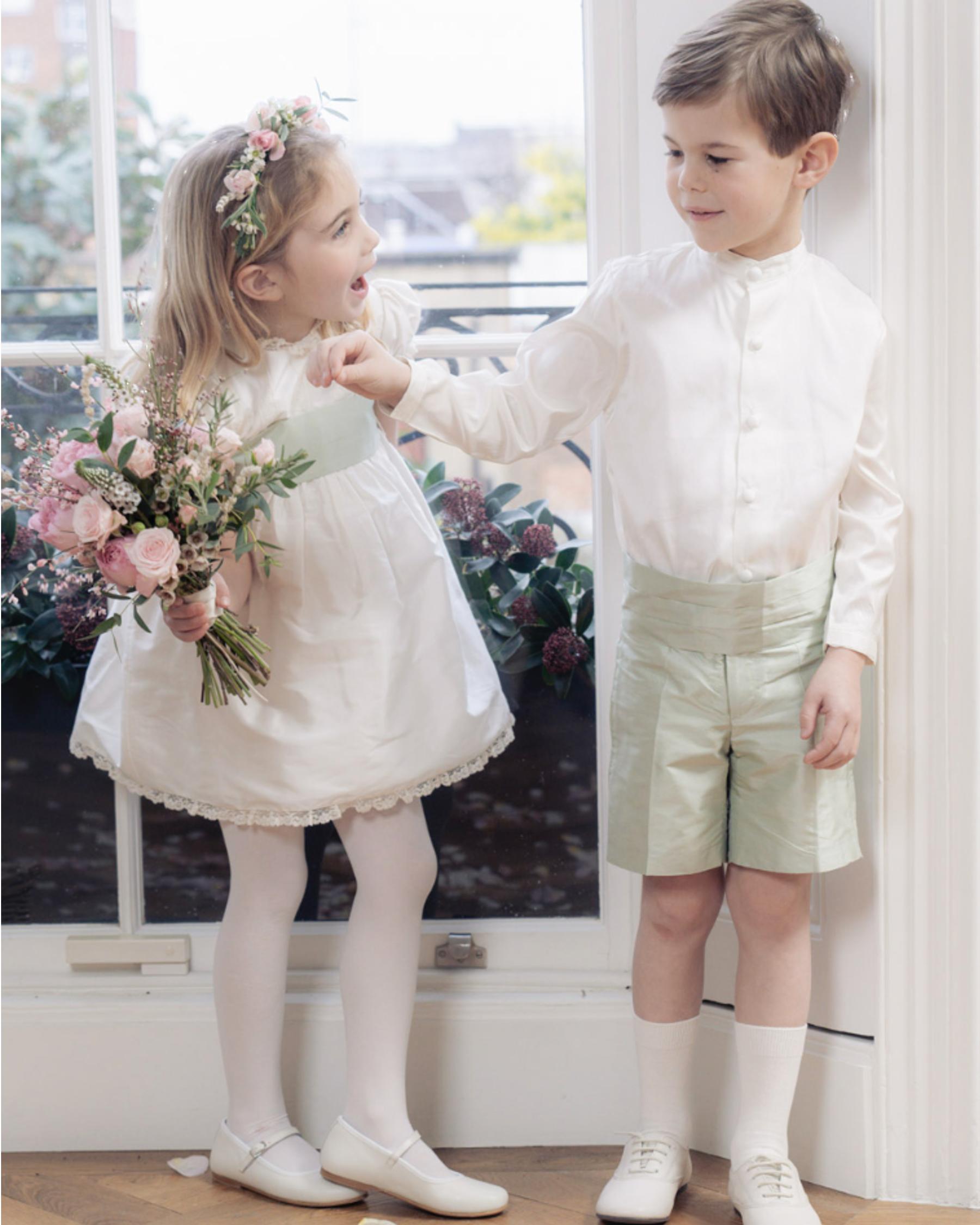 Crafted from soft and elegant mint silk, our boy's occasion shorts offer both style and comfort. Featuring two front pockets, belt loops, a button and zip front fastening and an elasticated waistband for the perfect fit, they're ideal for any special event. Pair them with our Bespoke shirts collection for a polished look.