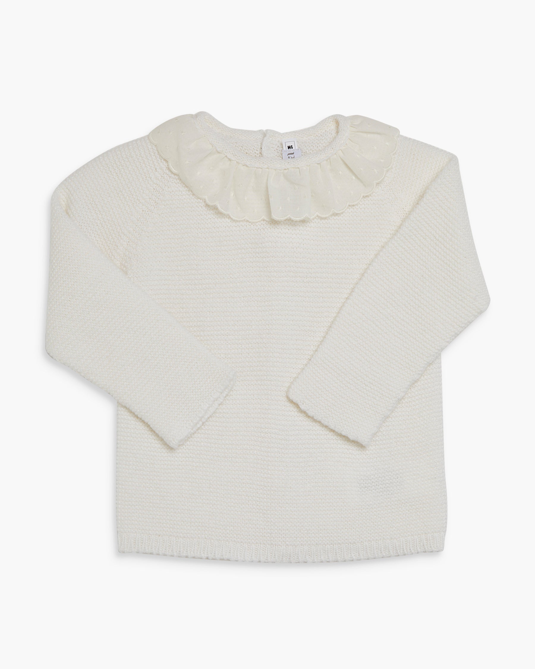 Indulge in the ultimate combination of cosiness and fashion with the Nora Baby Jumper Ivory. Its dropped shoulders and long sleeves provide a laid-back feel for lasting comfort. Adorned with a refined white scallop frill plumetti collar and lustrous mother of pearl buttons at the back. Complete the perfect baby ensemble by pairing it with our coordinating Evie leggings. An ideal present for a new arrival.